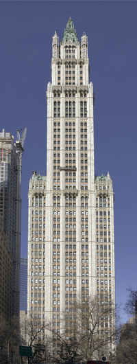 In 1912, New York Life assumed the mortgage for Madison Square Garden, which declared bankruptcy in 1917. Subsequently, New York Life acquired the building located at the northeast corner of Madison Square. In 1919, Darwin Kingsley, the company president, approached Gilbert about designing a new headquarters. While Gilbert’s office spent the next three years working on designs, the company did not choose the Madison Square site until 1923. [Heilbrun-2000 p. 147] The proposed building was to occupy an entire city block, bounded by Madison Avenue, East 26th Street, Park Avenue South, and East 27th Street, and conform to the recently adopted New York City zoning regulations for tall buildings that required setbacks. A design was presented and approved in 1924 and excavation began. Then in April 1925 with the excavation over 60 percent complete and structural steel fabrication well underway, Gilbert was ordered to abandon the design because the bids on construction costs were much higher than anticipated. The building was redesigned and construction resumed the following year. The new design substituted limestone cladding for the original marble that had been proposed, incorporated more setbacks, and added the gilded pyramidal roof with six stories for mechanical services. The new building was dedicated with a gala ceremony in December 1928. From the beginning, the building has been presented as a corporate symbol and a powerful advertising image. [Irish-1999 p. 151]